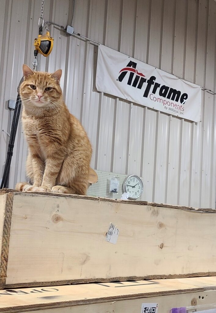 Eddie has been with Airframe Components since he was found among the wings outside in 2022. Eddie has brought much joy to our employees, especially our Shipping Manager, Jim, who feeds him every day. Eddie spends most of his time inside sleeping, seeking scratches, and trying to stow away in wing crates. Yes, we may have shipped him to Chicago inside a crate once! He spends his evenings outside mousing, or out in his palace (our old paint shop), which Roy has turned into a cat haven for Eddie.